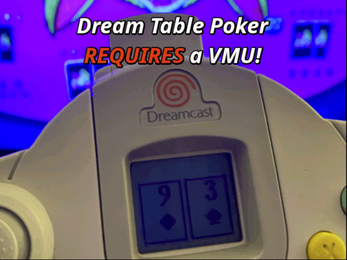 Dream Table Poker is a fast, stylish Texas Hold’em game built for Sega Dreamcast. Play heads-up in Arcade mode or sit and go 2–4 human players 2-8 CPU around the same table in local Multiplayer where every player can only see their cards using the VMU. This means every player can peek their private hand on their own VMU screen, just like at the casino — no screen-looking, pure tension. Casino vibes, chip clacks, instant all-in drama. Built for couch trash-talk, late-night money matches, and bragging rights. This is only the start: achievements, unlockable tables, system link are coming — grab the early build and claim exclusive high-stakes retro Dreamcast glory before anyone else.